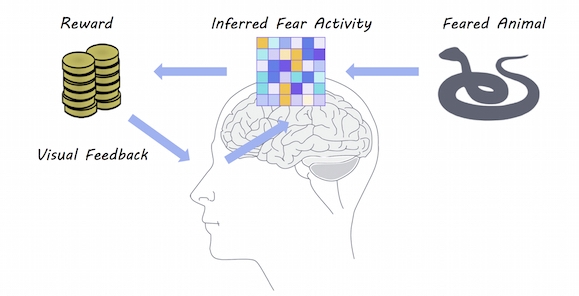 A group of individuals were shown images of feared animals during fMRI scans and brain activity patterns were decoded (using machine learning). These fear-related brain activity patterns were used to infer fear-related brain activity in the main study participants. The main group of participants underwent 5 days of neural reinforcement sessions. The goal was to use visual feedback to reinforce fear-related brain activity patterns, without actual exposure to the feared animal stimulus. During these sessions, a disc was shown on a screen to participants; the disk grew bigger in real time when participants’ brain activity better matched the brain activity pattern associated with a feared animal. Participants were awarded money in an amount proportional to the size of the disc. Both participants and researchers were blinded (i.e. did not know what the size of the disk represented). They then tested how well the neural reinforcement worked using well-established physiological fear responses: skin conductance and amygdala (a brain region processing fear) activation.