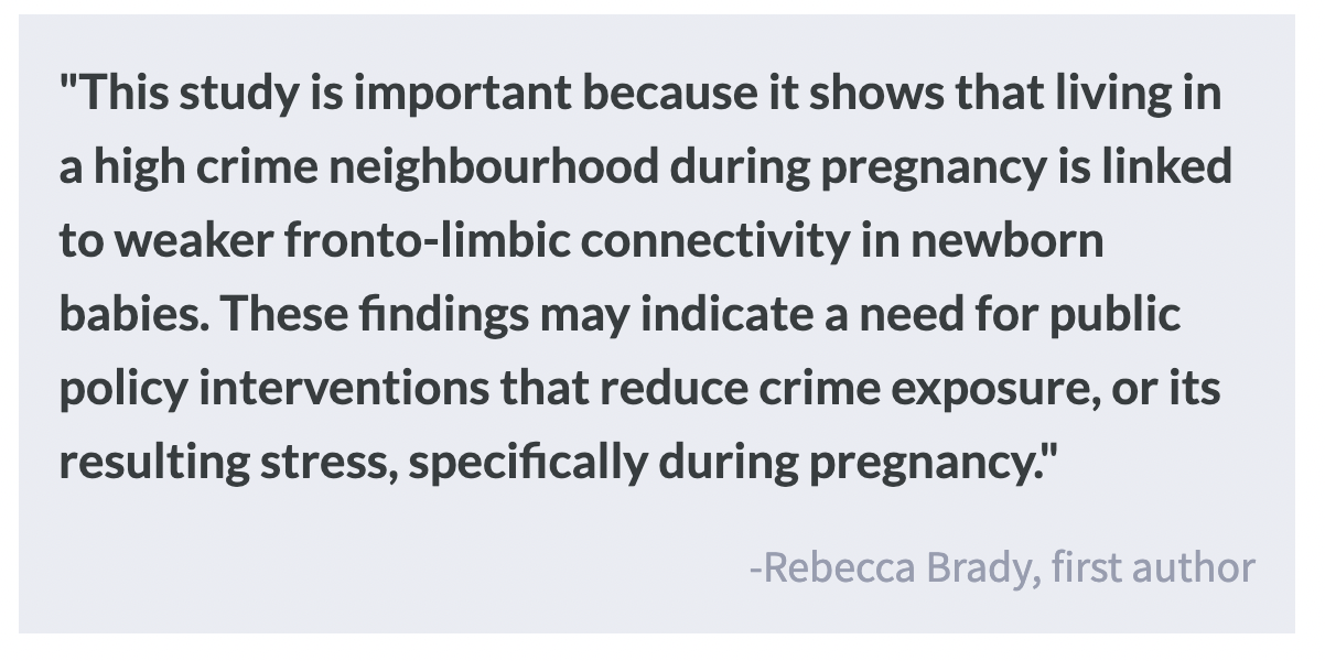 Living in neighborhoods with high rates of crime has an impact on neonatal brain activity at birth, and this is mediated by maternal psychosocial stress. Weaker neonatal brain connectivity in some areas of the brain is directly associated with higher crime rates.