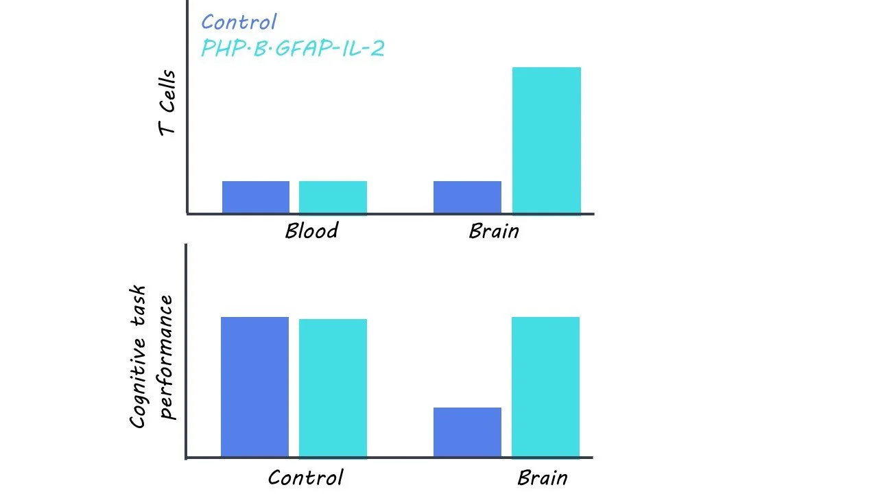 First, the researchers found that PHP.B.GFAP-IL-2 was successful in delivering the IL-2 gene to the brain with expression in astrocytes. Over the course of fourteen days following administration, there was a threefold increase in IL-2 production. This was accompanied by an increase in Treg cell production, which was not observed outside of the brain and was not accompanied by any adverse symptoms.