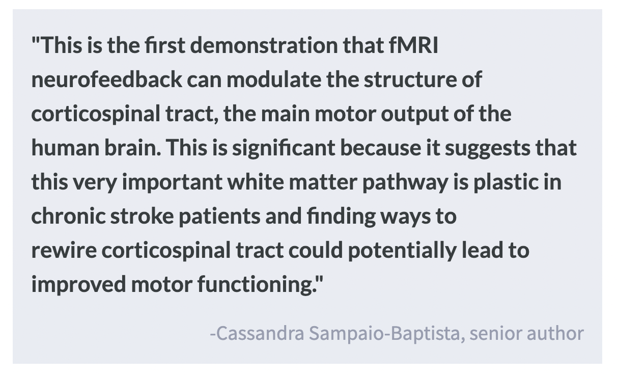 This study finds that stroke survivors were able to use neurofeedback training to increase neural activity in the motor cortex corresponding to their affected limb within a training day, but not across sessions. The neurofeedback also improved gross motor function and reduced structural asymmetry of the corticospinal tract. Overall, this study provides important evidence for the utility of neurofeedback in stroke rehabilitation. Future studies with larger samples and longer follow-ups are needed to determine the utility of this approach for long-term outcomes of stroke patients.