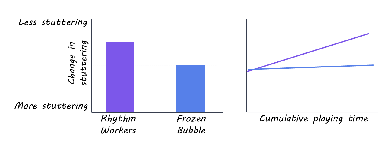 On average, both groups completed over 90% of the target amount of play time and reported enjoying the games, though there was variation between individuals in terms of their dedication and enjoyment. Both groups started out with similar scores on rhythmic behavior, attention/cognition, and speech, but the Rhythm Workers group showed some improvements in each category by the end of the intervention, while the Frozen Bubbles group did not. The more time participants spent in the Rhythm Workers game, the better their rhythm and stuttering scores were at the end of the intervention, while time spent in the Frozen Bubbles game was not related to rhythm or stuttering scores. Improvement in rhythm scores was also related to reduced stuttering.